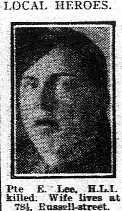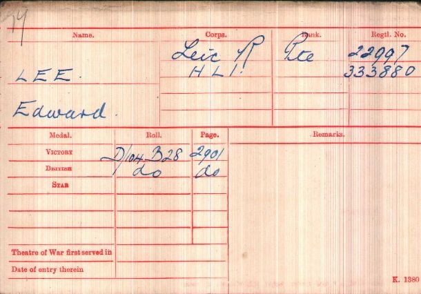 School records give a date of birth for Edmund as 28th Nov 1898 son of Harry Lee and Elizabeth Church, of 78, Russell St., Leicester. And left school on 29th November 1912. His parents married 3rd October 1885 at St Matthew’s Church in Leicester