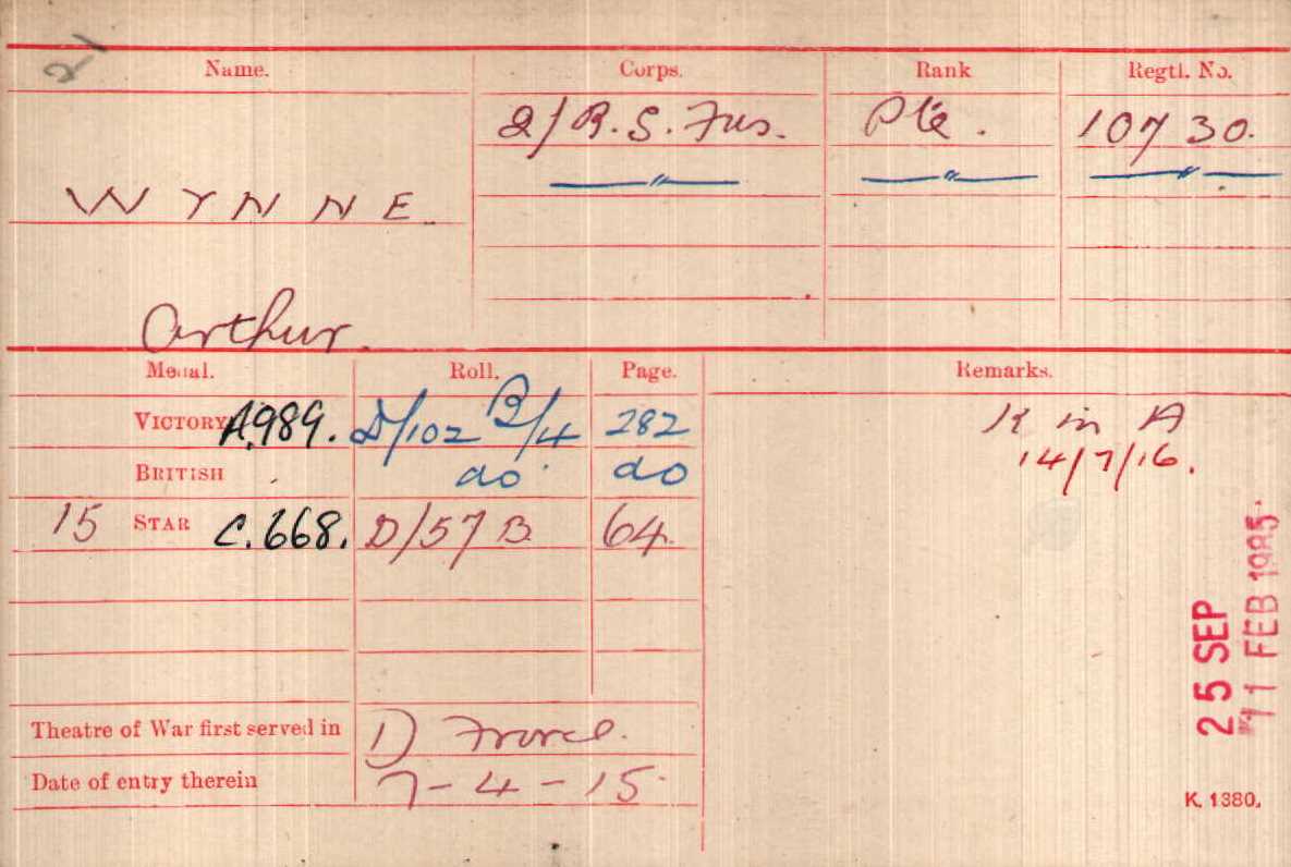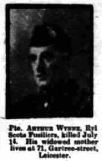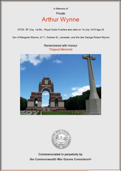 Born in Stafford in 1893, Son of Margaret Wynne, of 71, Gartree St., Leicester, and the late George Robert Wynne.